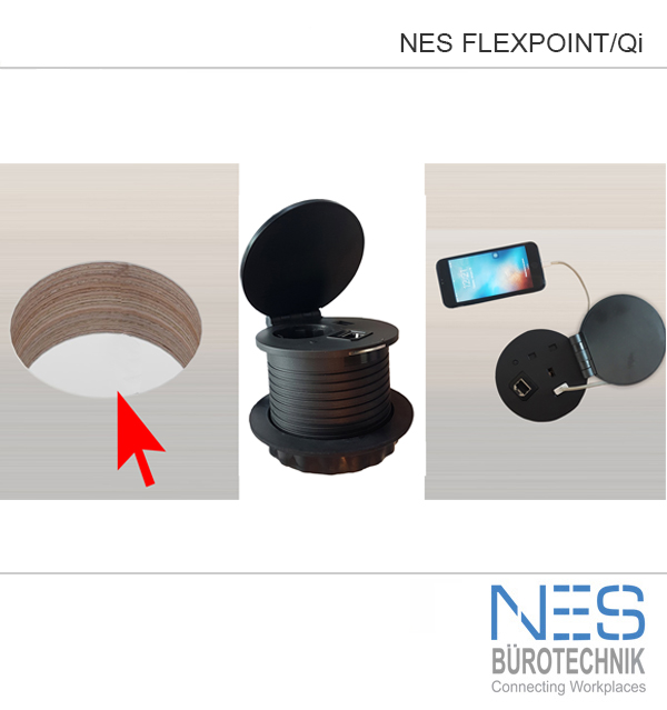 NES FEXPOINT/QI – The elegant kitchen appliances connectivity system. It complements the kitchen surface  with 1x additional power outlets and USB and wireless charging features.