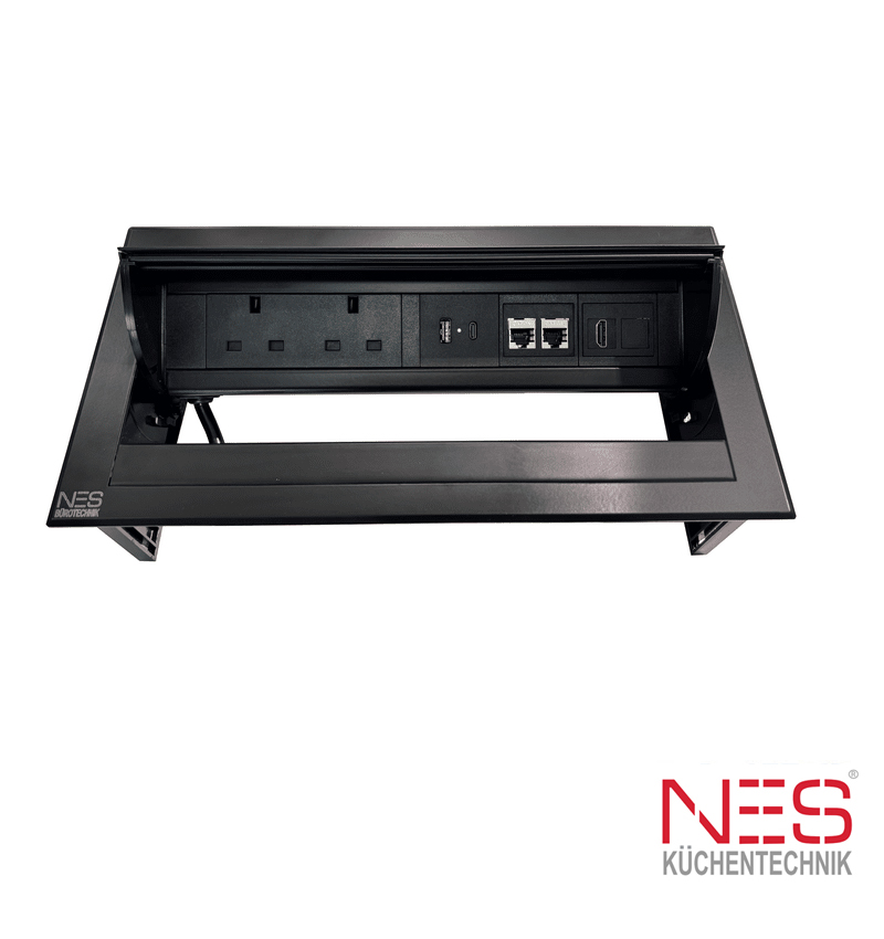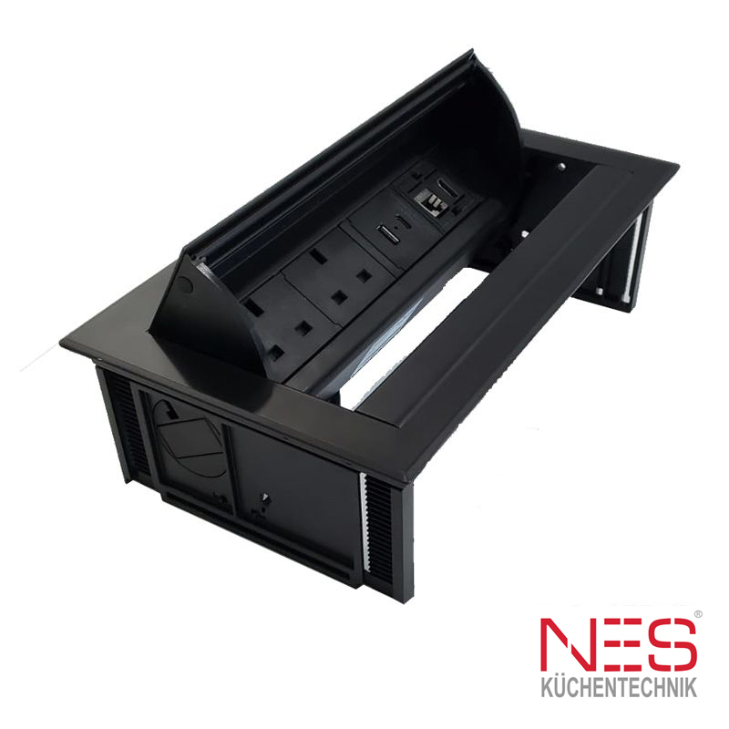 The one touch opening mechanism, perfectly provides power & USB connectivity in a modern kitchen.